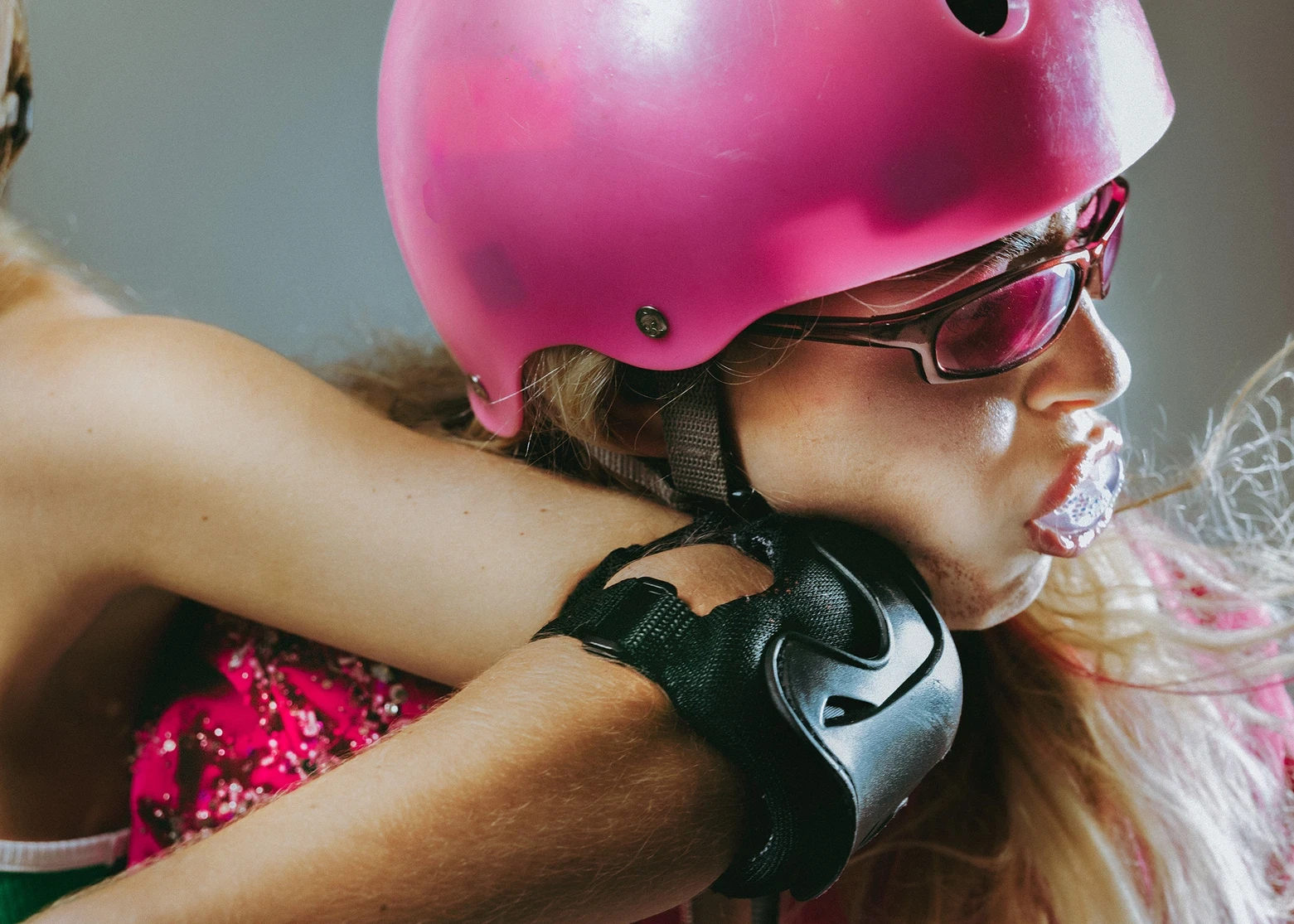 In the third and final installment of Ferrié’s project moves away from the idea of villainy, but brings to the forefront a motif that is also apparent in both her reimaginings of Cinderella and Sleeping Beauty; queer identity. To circle back to the first leg of this project; though not exclusively, rollerderbys existence as a cultural and athletic phenomenon has long created a space for female-identifying and generally LGBTQ+ individuals to explore different expressions of femininity through full contact sport. In Ferrié’s exploration of Maleficent however, reflections on gender and sexuality are more readily apparent to the viewer due to Mystic’s embodiment of the role.