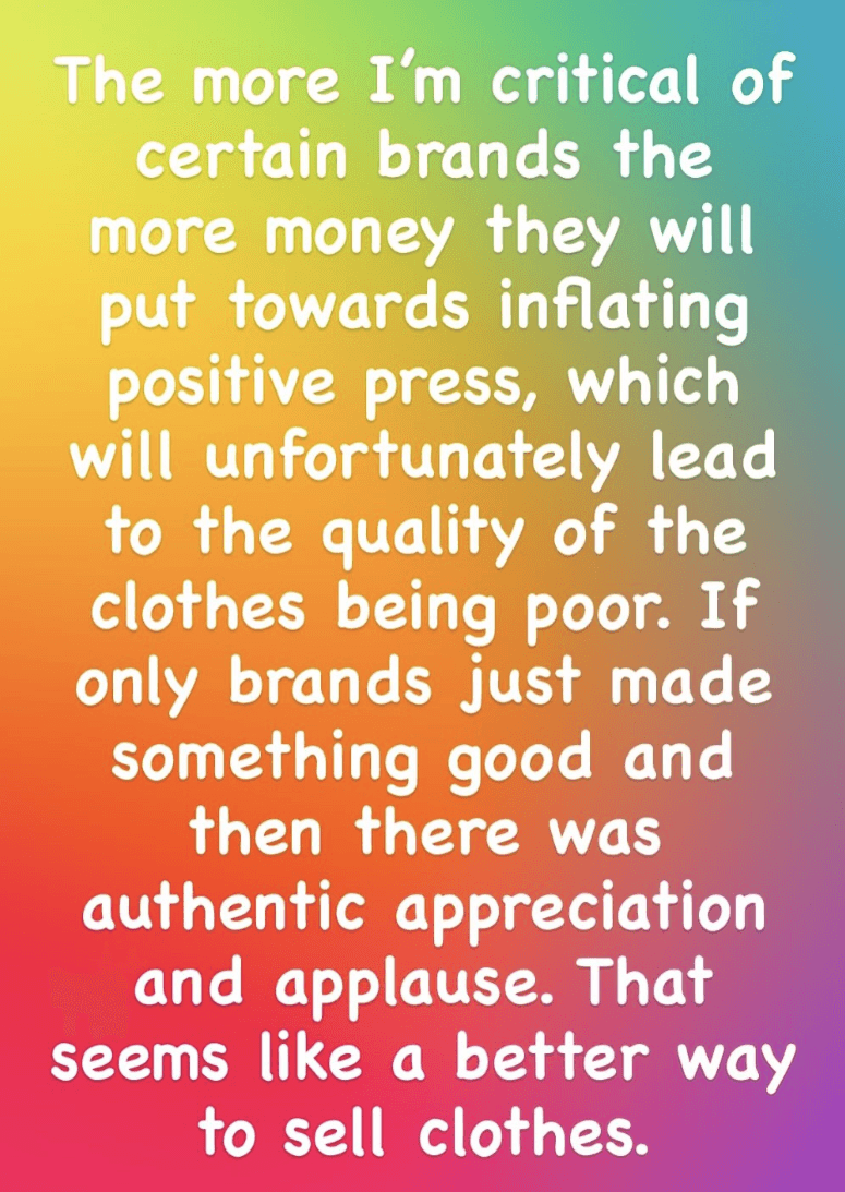 I was just tired of the industry saying that everything was good. When a lot of what we’re seeing on the runway is not. I think I have become a little bit disillusioned with the state of fashion journalism. I think back to when Cathy Horyn was banned from the Saint Laurent show or when Lyas wasn't invited to the Dior show after sharing criticism. I think influencers want to go to the next show so they hold their tongue when it comes to seeing the collections in person and I think journalists don't want to be blacklisted or have advertising pulled from magazines. Everyone walks a delicate balance. I think being anonymous is something that allows for more critical takes on the collections. Especially when certain brands look the same, but just have a different logo stitched inside.