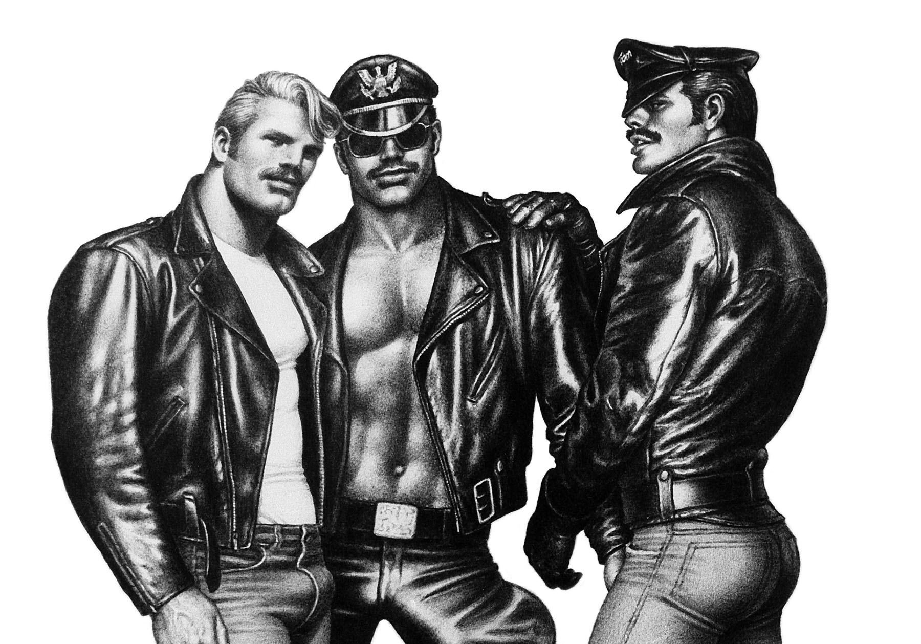 Drawing of 3 men in Perfecto-style jackets by Tom of Finland (source)
