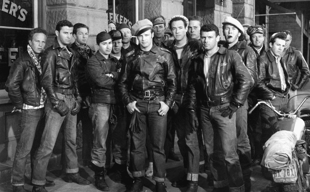 Still from The Wild One (1953), Marlon Brando in the front and center (source)